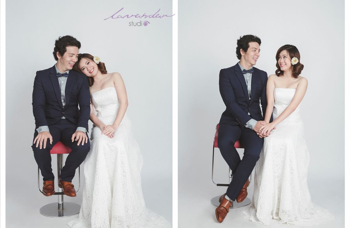 Bức hình được chụp tại studio hoặc phim trường. Cặp đôi trẻ tựa bên nhau thầm thì. Cô dâu gương mặt tươi cười còn chú rể ghé lại gần như đang trò chuyện vui vẻ cùng nhau. Chân cả hai bắt chéo tăng thêm nét thanh cao.